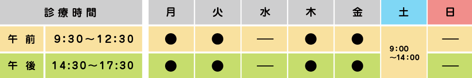 ※休診日…水曜,第3木曜,日曜,祝日 ※土曜日は9:30~14:00